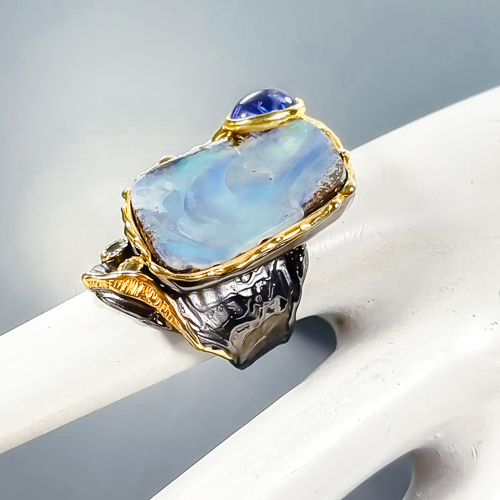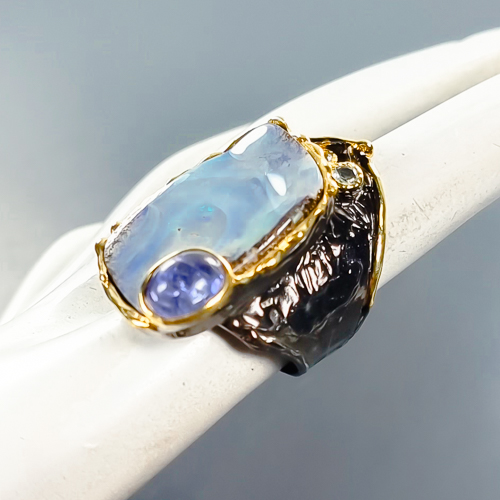 Δαχτυλίδι σε ασήμι 925 με μαύρο και κίτρινο επιχρύσωμα στα 14Κ με φυσικό Αυστραλιανό Οπάλιο σε κοπή Fancy με Opaque διαφανεια καθαρότητα υπέροχα χρώματα και βάρος 48.77 ct Το κόσμημα συμπληρωνουν ένας Τανζανίτης σε Oval Cab κοπή με Transparent διαφάνεια καθαρότητα και βαρος 2.00 ct και δυο Ακουαμαριν σε στρογγυλή κοπη με ανοιχτο γαλαζιο χρωμα και βαρος 0.40 ct. Η προέλευση των λίθων είναι απο την Αυστραλία, την Τανζανία και την Βραζιλία.