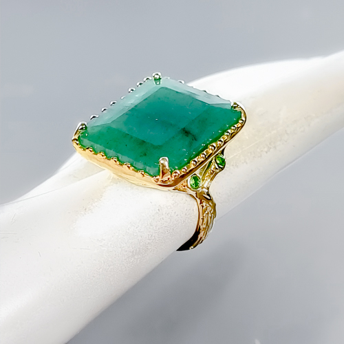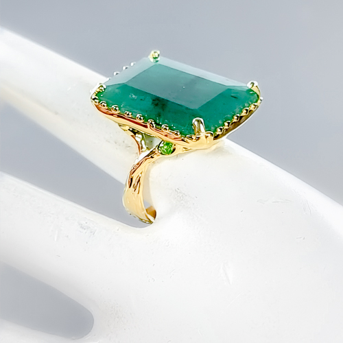 Δαχτυλίδι σε ασήμι 925 με κίτρινο επιχρύσωμα στα 14Κ με Σμαράγδι σε σχήμα octagon με translucent/Opaque καθαρότητα στα 55.82 ct με έντονο πράσινο χρώμα, Το κόσμημα συμπληρώνουν και 3 πετράδια Χρωμοδιοψιδιους στα 0.15 ct σε Round κοπή και Vvs διαφάνεια. Η προέλευση των λίθων είναι απο την Ζάμπια και την Ρωσία.