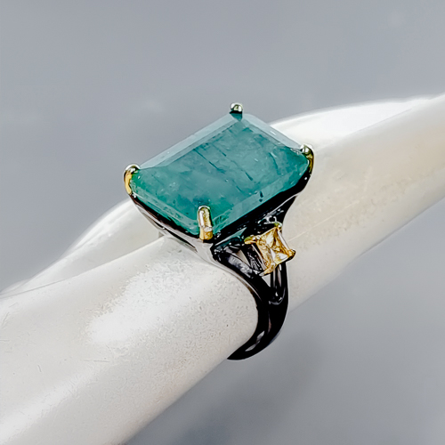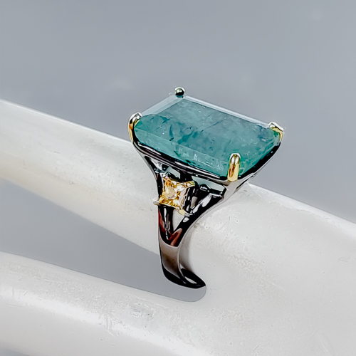 Δαχτυλίδι σε ασήμι 925 με μαύρο και κίτρινο επιχρύσωμα στα 14Κ με Σμαράγδι σε σχήμα octagon με translucent καθαρότητα στα 25.12 ct με έντονο πράσινο χρώμα, Το κόσμημα συμπληρώνουν και 2 πετράδια Κιτρίνη Χαλαζία στα 1.60 ct σε Princess κοπή και Vvs διαφάνεια. Η προέλευση των λίθων είναι απο την Ζάμπια και την Βραζιλία.