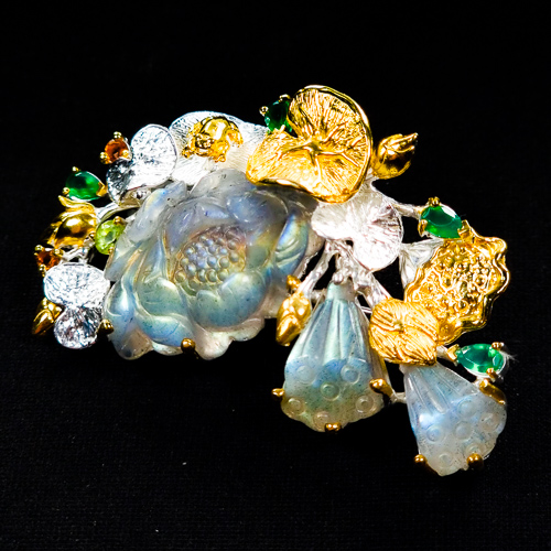 Καρφίτσα/Μενταγιόν σε ασήμι 925 με λευκό και κίτρινο επιχρύσωμα στα 14Κ με τρία πετράδια σκαλιστού Λαβραδορίτη σε σχήματα λουλουδιών με Translucent καθαρότητα διαφάνεια στα 53.88 ct βάρος. Το κόσμημα περιέχει και 4 Σμαράγδια σε κοπή Pear με transparent καθαρότητα στα 2.40 ct. Ένα Περίδοτο στρογγυλό με vvs διαφάνεια και βάρος 0.40 ct και τέλος το κόσμημα συμπληρώνουν και 2 κίτρινα Ζαφείρια σε round κοπή με vvs διαφάνεια καθαρότητα και συνολικό βάρος 0.20 ct. Η προέλευση των λίθων είναι απο την Μαδαγασκάρη, την Βραζιλία, το Πακιστάν και την Σρι-Λάνκα.